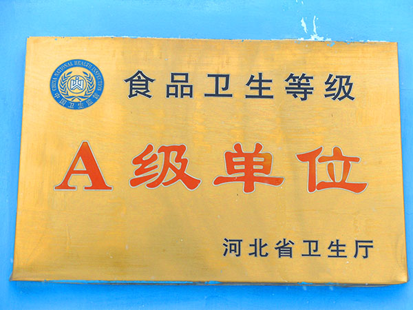 河北省卫生厅颁发“食品卫生信誉等级A级”企业称号